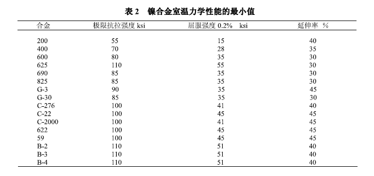 除纯镍外,化学加工业所用的镍合金强度大大高于300系不锈钢。镍合金还具有非常好的延展性和韧性(见表2所列的室温力学性能)。用于化工设备的大多数合金的最大许用应力见ASME锅炉和压力容器规范第Ⅷ卷。