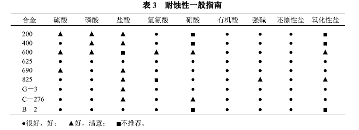 化工厂常见介质条件下镍合金耐蚀性能的比较见表3。这些一般性指南不用于特定目的,仅作为选材过程的起始点。