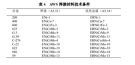 大多数镍合金焊接都采用手工电孤焊(SMAW)、气体保护钨极电弧焊(GTAW)和气体保护熔化极电弧焊(GMAW)。镍合金焊接件延展性非常好,它们较低的热膨胀特性减少了残余应力和弯曲变形。仅沉淀硬化型牌号要求焊后热处理。美国焊接学会(AWS)发布的镍合金焊条和填充金属技术条件见表4。