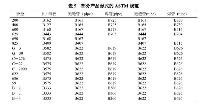 市场上可以买到的镍合金产品形式多种多样,包括中板、薄板、带材、管材、接头和锻件。部分产品的ASTM规范列于表5。某些镍合金还有铸造产品,它们通常具有与其锻轧产品不同的特性。
